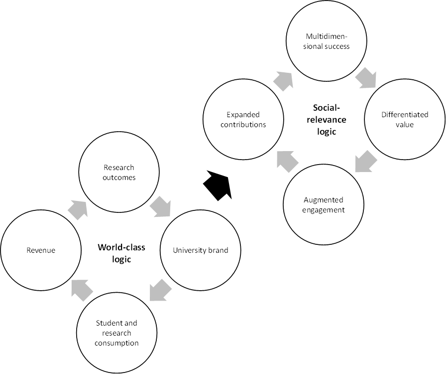 Second, it was deduced that the strategic flow which has grown to undergird and shape higher education in the recent global growth era needs to change. Shifting to an integrated or universal space sparks new academic and institutional assumptions Figure 2 depicts the under the ‘world-class logic’, globally striving universities parlay tuition revenue into research and specifically publication outcomes to inflate the university brand to stimulate consumption and growth. Universities have become too obsessed with the notion of measuring research outputs. Community connection and engagement have taken a backseat. According to a ‘social-relevance logic’, already being implemented at scale in various systems, universities create value on many fronts, parlay this into many forms of augmented engagement, expand their scope and scale of their contributions, and generate multidimensional successes. This broader view embraces accomplishments in advancing the workforce and tackling government and industry challenges.