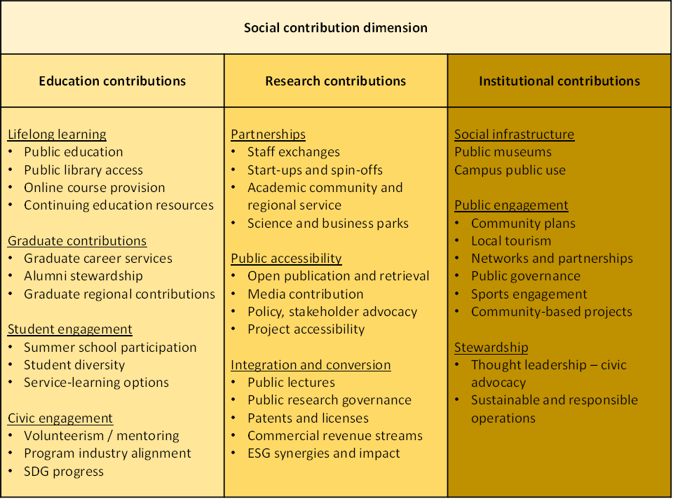 Social contribution can be viewed as spanning regional engagement, national development, and international impact. The scope of such engagement is of course shaped by the mission, scale of the university and locations in which it operates and serves. In general terms social contribution may be organized into forms of engagement that stem from leading education and research, operations and governance. For instance: