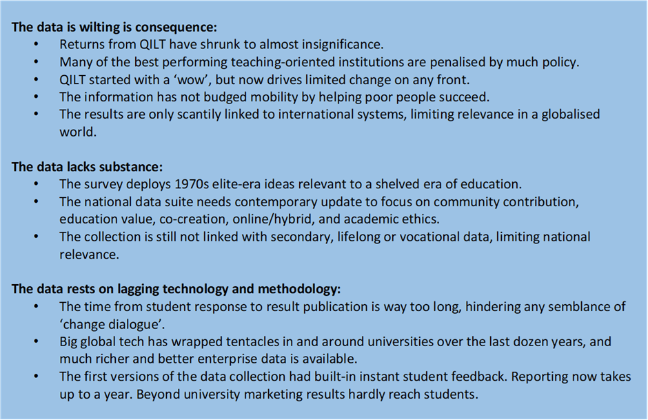 Figure 2 presents a case study of the need to redo the prevailing student quality data in Australian higher education. The case provides practical, substantive and technical snapshots as to why Australia’s domestic prevailing data system QILT is wilting and needs a major refresh. It is time to recycle, and fire up more sustainable value-creating contributions. The QILT collection is dated, error-riddled, hardly spurs a policy murmur, and fails to ignite education or social change. Major education systems and big global companies are already delivering new solutions. Australia, once innovator, now lags. Australia needs to implement tomorrow’s solutions, most already validated and ready to go. 2050 starts today, as it takes two decades to bed-down major data collections. Let’s imagine and create!