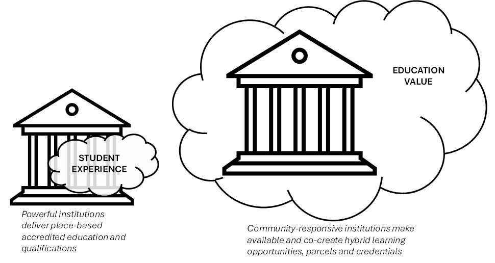 This move involves shifting institutional emphasis on traditional ‘student experience’ to a much broader, more socially deliberative concept of ‘education value’. This view looks at how much larger and more integrated education institutions engage many more communities and learning arrangements. This is very different from looking at the engagement of admitted students within institutions, and only minor interactions with ‘outside’ communities. This shift envisages both looking at how students participate within prescribed frames and looking at how students and institutions engage in hybrid ways to co-create learning opportunities and credentials.