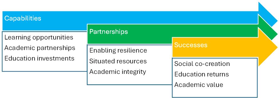 Synthesizing cross-national research has helped render nine topics that advance ‘education value’, and help universities and people engage in broader ways. We can articulate these topics in terms of three capabilities (inputs), three partnerships (processes), and three successes (outcomes) (Figure 5). These topics go well beyond the larger and more developed array of information developed over recent decades to measure ‘student satisfaction’, ‘student experience’ or ‘student engagement’ listed in Figure 4. These nine education value measures are unpacked below.