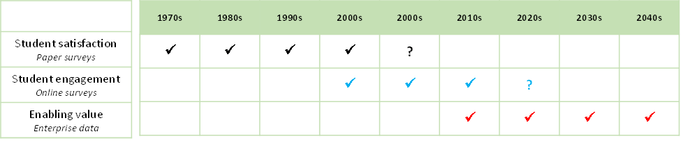 Student satisfaction measures boomed years ago. More than thirty years ago, universities grew beyond an era when most people might have known each other by name, and it became necessary to produce more meaningful and objective information about education. Student satisfaction statistics garnished with scholarly rhetoric were spread entrepreneurially throughout the English-speaking world. Powerful new information on student engagement was advocated by United States experts, growing into one of the sector’s largest information regimes. Australia leveraged these developments to implement then-innovative information on students’ engagement with effective education experiences. This data became sector-wide, institutionalised, then nationalised. This data regime centered on enrolled learners, replacing one developed decades earlier focused on graduates.