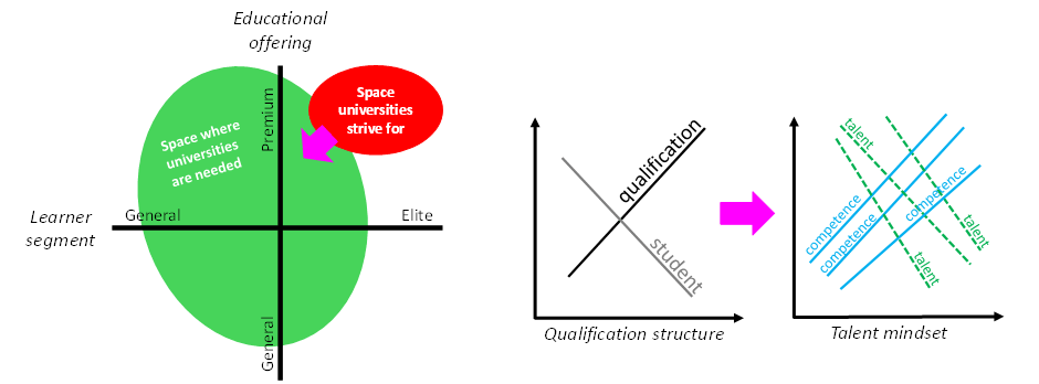 This infrastructure sparks a raft of far-reaching reforms which work to engage higher education institutions in skill-led learning. In short, while higher education institutions, primarily universities, have traditionally maneuvered to sell priced-up and bundled and prestige qualification products to premium learner segments, there is growing population-wide and career-long demand for more individualized and atomized forms of learning. Figure 2 depicts this misalignment problem in terms of institutional positioning and product offering. To align university provision with future demand, universities need to be steered away from homing in on affluent segments with premium products and offering bundled qualifications to individual students. As the arrows convey, it will be necessary to shift into less affluent market space and offer specific competencies that match and augment specific talent needs.
