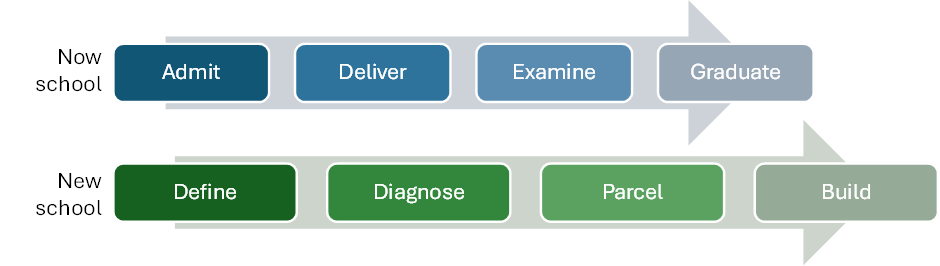 Evidently, new platforms (digital and otherwise) are required to facilitate skill-led learning. Existing institutional structures and platforms support the delivery of pre-packaged supplier-defined courses. Smarter learning platforms are needed to diagnose existing capability, recommend learning goals and pathways, leverage AI to predict industry trends and align educational content accordingly, and coordinate modular and secure digital credentialing systems. Management platforms need to coordinate different student and course profiles. Ample marketing and support infrastructure is already primed to pounce. As always in education, the most important and difficult frontiers to push forward are those which are social, cultural, and professional. Career-spanning learning partnerships go beyond discrete qualifications, alumni relations and philanthropy, and transactional teaching experiences. Novel managements systems are required which give play to outcome-based learning metrics, social engagement, and education contribution.